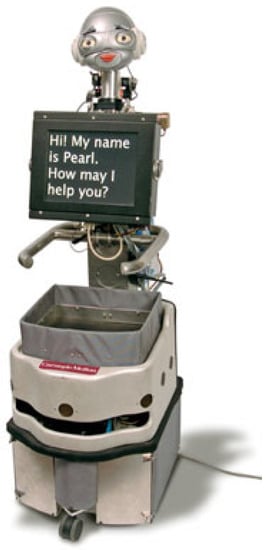 The project of Pearl as an autonomous mobile robot was started under the Nursebot project at Carnegie Mellon University in order to respond to seniors’ daily challenges such as reminding and environmental guidance [64]. Figure 4 shows the Pearl robot. This robot can navigate autonomously, recognize speech, detect faces and compress images for better online video streaming [65,66]. The users interact with Pearl via speech and a touch-screen graphical display [67].