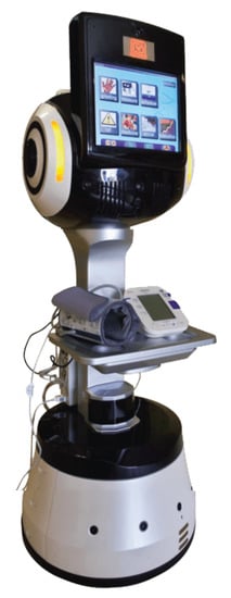 The HealthBots project is a large-scale joint project between the University of Auckland, Electronics and Telecommunications Research Institute (ETRI) and Yujin Robot. The development of admissible healthcare robots for the ageing population and caregivers was the primary goal of this project. The researchers of HealthBots tried to design a multipurpose service robot. This robot can be used as medication [93] or schedule [94] reminder, a detector of possible falls through a ZigBee network [95], an entertainer or memory assistant [96] and a telephone caller [97]. Moreover, the HealthBot measures vital signs such as blood pressure, arterial stiffness, pulse rate, blood oxygen saturation and blood glucose levels [97]. Figure 8 shows the last version of HealthBot.