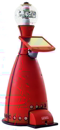 The Robovie is a human-like robot designed by Advanced Telecommunications Research Institute (ATR) in Japan to communicate properly with humans. The platform of Robovie-II consists of 2 arms, 16 skin sensors, 24 ultrasonic sensors for obstacle detection, 10 tactile sensors, 2 microphones and vision sensors. This generation can work for four hours, and its eyes have a pan–tilt mechanism suitable for stereo vision and gazing control [58,59]. The Robovie-II robot is represented in Figure 3.