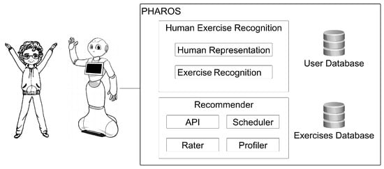 Aside from its diverse abilities, Pepper is a fully programmable platform. For example, Yang et al. [115] applied reinforcement learning (RL) and human feedback to improve the robot’s ability in task execution. Furthermore, a modified version of this robot was presented with the name of PHysical Assistant RObot System (PHAROS) [116,117] that was planned to assist OAs in their daily activities and recommend and monitor physical activity exercises. The platform of PHAROS consists of three main sections: a Pepper platform, human exercise recognition through DL methods for exercise monitoring and the Recommender, a smart-decision maker for recommendation of the most suitable physical exercises with respect to the user’s physical limitations. Figure 11 shows a view of PHAROS software and hardware.