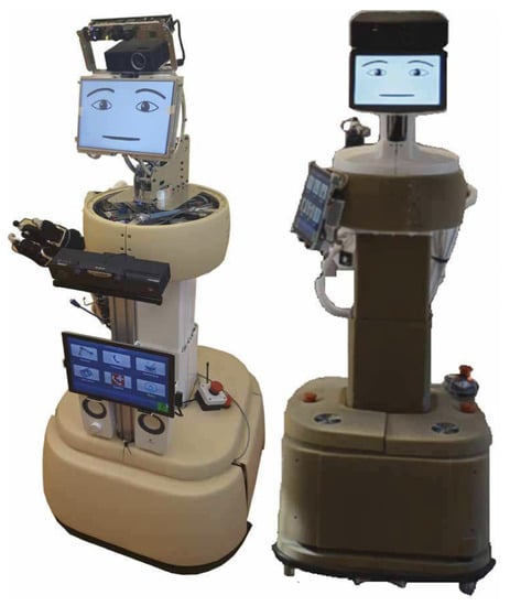 RAMCIP (Robotic Assistant for MCI Patients) is a service robot that provides safe and proactive daily assistance to the ageing population, especially those with memory impairments. This project is coordinated by the Centre for Research and Technology Hellas in Greece under EU Horizon 2020 program [122]. RAMCIP can be used in a vast number of categories of tasks consisting of emergencies (fall detection and gas/smoke detection), assistance in keeping the home safe (turning off electric appliances such as an oven or turning on lamps for locomotion), communication with relatives and friends, reminding to take medication, supporting in food preparation and picking up fallen objects [123,124]. Two versions of the RAMCIP robot are shown in Figure 12.
