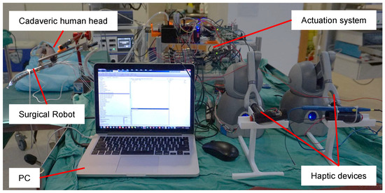 Cadaveric trials have been designed and conducted to evaluate the feasibility of this flexible and compliant surgical robot operated in a master-slave teleoperation mode. Figure 2 shows the experimental setup. A cadaveric head from a man aged 45, which contained intact tissues in the oropharyngeal region and had never had any surgeries in this area, was utilized as the subject. A retractor kept the mouth open and left enough space for the robot. The surgical robot was mounted to a multi-DOF magnetic base holder so that the position and orientation of the robot could be quickly adjusted as required. Operators can steer the surgical robot using two haptic devices (3D Systems, South Carolina, CA, USA), connected to the PC via ethernet at the master side. The controller, implemented in MATLAB/Simulink, processes command signals from the haptic devices and sends corresponding control signals to the motor control boards via serial communication. These controller boards control the actuation units to generate actuation force to drive the robot at the slave side to complete desired motions. The vision unit in the execution part can provide visual feedback to the operator. The surgical instruments are controlled by the buttons, which are carefully devised and fixed to the handle of the haptic devices.