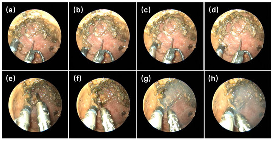 Figure 4a–h demonstrates the operation process of two manipulators in the cadaver trial, including the grasping and cutting. In the process of grasping, the left manipulator equipped with a vacuum suction was steered to adjust its orientation, as shown in Figure 4a,b. After that, it was controlled to approach and slightly contact the target tissue using the suction cup, as shown in Figure 4c. Finally, the vacuum suction was started to grasp the tissue, which was retracted to facilitate the cutting process, as shown in Figure 4d. In the cutting process, the right manipulator, which was equipped with a monopolar electrotome, was firstly manipulated to adjust its position and orientation relative to the left manipulator, as shown in Figure 4e,f. Then, the monopolar electrotome was used to cut the grasped tissue (Figure 4g). To cut the target tissue, the right manipulator was controlled to rotate around the left manipulator, as illustrated in Figure 4h. Finally, after the resection was complete, the robot was controlled to return to its initial state.