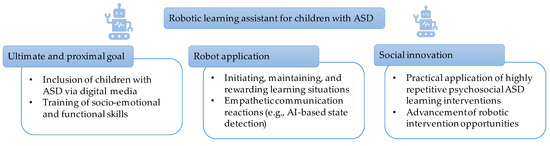 In order to support both therapists and parents in the treatment of children with ASD, a social robot may accompany and support children at different levels of the disorder and different stages of development with the completion of various therapeutic exercises. Compared to a real person, a robot is assumed to reduce the pressure of a challenging social situation and to create a unique learning environment for children diagnosed with ASD [29,54]. Robots are already prevalent in the field of ASD treatment; however, this robotic system is planned to expand existing technologies with a targeted initiation of learning processes, intelligent steering of attention, and mitigating of distracting emotions.