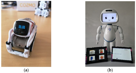 Next, the basic idea of a platform for ASD-related information, exercise material and exchange opportunities, which is another subproject of the research project, was presented to and evaluated by the parents and therapists, which is not further elaborated in this paper (since the focus lies on the robotic learning assistant). Subsequently, parents and therapists were asked about attitudes and expectations as well as wishes concerning the use of robots in psychotherapy (see Appendix A and Appendix B for the complete interview guide). Specific desired characteristics, for instance regarding functions and appearance, were assessed as well as whether children with ASD would benefit from and be interested in this kind of technology. In the next section of the interviews, two use case scenarios with two different socially interactive robots were presented to the participants including exemplary videos of the robots. The presented robots included the Cozmo robot by Anki© (San Francisco, CA, USA) (see Figure 2a) and the QTrobot by LuxAI© (Luxembourg, Luxemburg) (see Figure 2b). These two robot types were presented to show two different approaches to socially interactive robots and offer vivid images for a more consensual understanding and substantial discussion. The QTrobot was chosen since it is particularly designed for the use in behavioral therapy for children with ASD. The robot can show facial expressions via an LCD display and has a variety of advantageous pre-installed software such as speech recognition and hardware (e.g., cameras and microphones; [76]). The Cozmo robot was chosen as additional, contrasting example since it differs optically and functionally to a large extent from the QTrobot: it is much smaller, non-anthropomorphic, more limited in its verbal interaction abilities, and costs only a fraction. The Cozmo robot is predominantly used as a toy, but also to examine HRI phenomena (e.g., [77,78]). For each robot type, the interviewees answered questions regarding their first impression and opinion of the robot and whether they would welcome the use of this robot within the therapeutic context of children with ASD. The last question assessed participants’ preference for either the QTrobot or Cozmo robot by asking them to name positive and negative aspects of each robot type from their point of view.