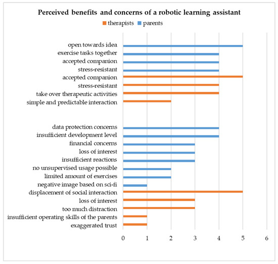 The interviewed parents are generally very open towards the idea of using a social robot with an AI-based state detection system to support their children (5/5; see Figure 3 for the parents’ and therapists’ perceived benefits) and think that their children would accept the robot as stress-resistant (e.g., “it does not allow itself to be provoked”; 2/5) companion (4/5) to exercise tasks together (4/5). Similarly, the therapists also described the robot as stress-resistant (e.g., “without getting tired or frustrated”; 2/6), accepted companion for the children (e.g., “such a technological device is rather interesting, because it makes them special”; 5/6). They added the following benefits: the interaction with a robot is simpler and more predictable than with a person (2/6) and the robot can take over some therapeutic activities (e.g., “the robot has not taken over the function of the therapist completely, but a little bit and that […] is great […] due to the lack of therapists”; 4/6).