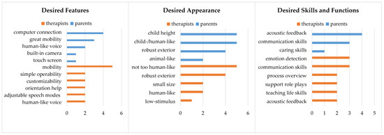 In addition to mobility (5/6) and a human-like voice (2/6), the interviewed therapists name adjustable speech modes (e.g., “varying the instructions a little […] from very structured to a little more open”; 2/6), an integrated orientation help (e.g., “a progress bar so that the child sees or the robot says ‘Come on! Two more times”; 2/6), general customizability (e.g., “it would be nice if the robot could say the name of the child”; 2/6), and simple operability (2/6) as desired features. The robot’s appearance is preferred by the therapists to be low-stimulus (1/6), human-like (2/6), but without too many human-like characteristics (e.g., “one would need to see that it is a robot and no human being”; 5/6), with a robust exterior (e.g., “we often observe that children throw things from the table, when they are frustrated”; 4/6) and a small size (2/6). Regarding skills and functions, the therapists wish for communication skills (3/6), acoustic feedback/noises (e.g., “verbal praise is accentuated with clapping and an unsuccessful attempt with […] a typical melody going down”; 2/6), detection of and feedback to emotions (e.g., “You look tired. Do you need a break?”; 3/6), as well as teaching and supporting practical life skills (e.g., “that brushing teeth for example is accompanied”; 2/6). The robot further is desired to have functions to support role plays (2/6) and to give an overview regarding the child’s therapeutic process (e.g., “within the robot it is saved what the child already did”; 2/6). Please see Figure 4 for an overview of the parents’ and therapists’ desired features, appearance, and functions of a robotic learning assistant.