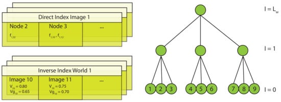 Structure of vocabulary tree and direct and inverse indexes. The inverse index stores the weight of the words in the images. The direct index stores the features of the images and their associated nodes at a certain level of the vocabulary tree.