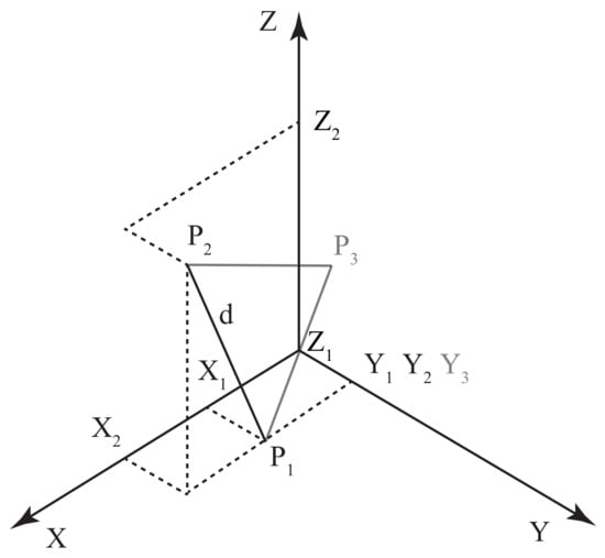 Similar triangles are triangles that are geometrically identical, and the corresponding sides of similar triangles are always the same. Therefore, the concept of similar triangles has been used for geometrical verification of the proposed VPR. For geometrical verification, the previously chosen meaningful features are fed to PnP [] method to generate the 3D points. Therefore, similar triangles are computed, one from an instantaneous camera frame and the other from the database, to test whether a scene of an instantaneous frame is similar to the index in the database. Figure 2 shows the process of geometrical verification for correct place recognition. The PNP method doesn’t produce a very similar position every time, as it is affected by the camera sensor noise and illumination changes. But it is empirically found that the threshold tolerance works well within less than 2%. The concept of calculating 3D points has been shown in Figure 3. Each side of the triangle is calculated as follows: