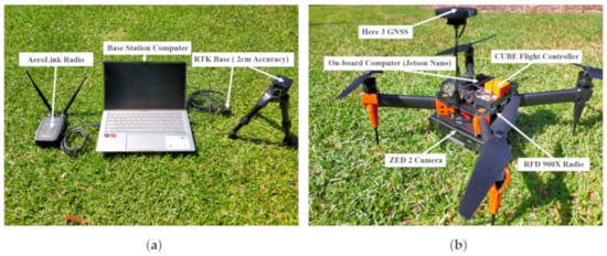 The base station and Micro Aerial Vehicle (MAV) setup for the recorded Victoria Park dataset: (a) shows the base station consists of Aerolink radio telemetry, RTK base having 2cm of accuracy. A base station computer; (b) shows the setup of the MAV consisting of Here 3 Global Navigation Satellite System (GNSS), Jetson nano onboard computer, CUBE flight controller, ZED 2 Stereo Camera and RFD 900X long-range radio telemetry. Both the base station and the MAV are wirelessly linked by long-range radio telemetry.