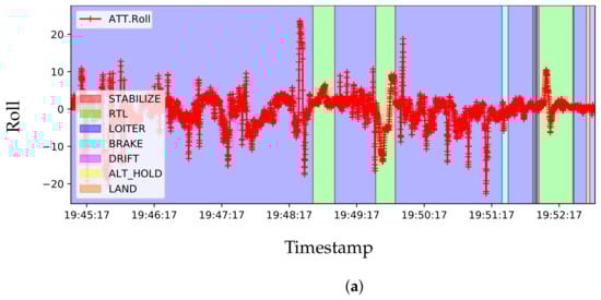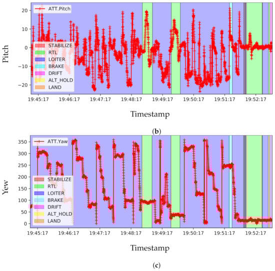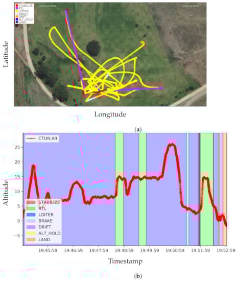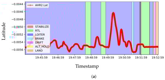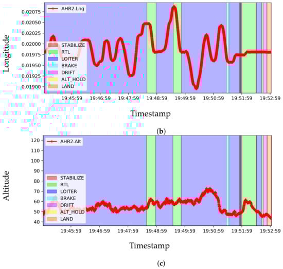 Figure 6 shows the recorded dataset’s latitude, longitude, and altitude. The background colour of each plot shows different flight modes, as shown in the legends. A few flight modes have been used for the dataset recording, Stabilize, RTL, Loiter, Brake, Drift, Alt Hold (altitude hold), and Land. The Stabilize mode attempts to self-level the roll and pitch axis of the MAV during the flight. The RTL mode (Return To Launch mode) navigates the MAV from its current position to the home position. The Loiter mode automatically attempts to maintain the current Global Positioning System (GPS) location, heading and altitude. The Brake mode stops the MAV as soon as possible once it is triggered. The dataset is mostly recorded with Loiter flight mode. It is shown in Figure 5a how the geo-position changed when the dataset was recorded. The varied geo-positions and altitude affect the performance of the visual place recognition systems which has been discussed in the later part of the experimental results.