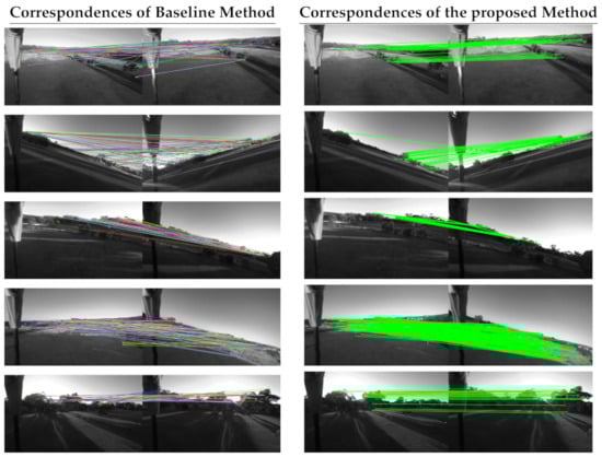 Figure 8 shows the comparison of feature matching from different viewpoints, meaning having different geo-position and orientations with respect to previous frames. The changes in orientation and position of the presented frames are shown in Figure 6 and Figure 7. The matching lines are presented in diverging colourmaps, where the green matching lines represent the more confidence level of the corresponding points and blue represents the lower confidence level. In Figure 8, the left column shows the correspondences using the method by Sarlin [], where it can be seen the miss matches of corresponding points in the Victoria Park dataset for its highly repetitive patterns and illumination changes. Conversely, the proposed method produces more accurate and stable matches with significant viewpoint and illumination changes. Most importantly, it avoids less meaningful features like grasses and tree shadows. For this challenging dataset, the proposed method finds a good number of correspondences with high confidence to ensure a correct place recognition.