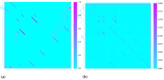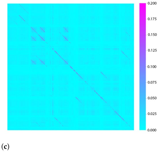 Figure 9 shows the similarity matrix for different methods on the New College dataset []. The similarity data have been presented in heatmaps, and each subfigure shows the heatmap of the 4024 images. Each pixel of the subfigure shows the similarity score of that candidate compared with the entries in the database. The lighter the image’s pixel intensity, the more similar the image in the database. Figure 9a shows the ground truth for the New College dataset. It can be seen that the background colour is very plain as the intensity of the comparison is zero. Therefore, the whole plain background has the same similarity score. The dark pixel shows the overlapping high similarity score with the entries. Light background with a highly dark foreground represents a desirable higher singular score. When the background and foreground colours are blended, the place recognition system disregards the place recognition. If Figure 9b,c are compared considering the above measures, it can be seen that the proposed method produces the best similarity matrix, which is quite close to the ground truth similarity matrix.