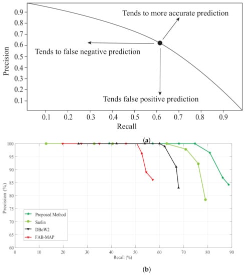 Precision and recall accuracy demonstrated in the curve: (a) performance relationship of place recognition in the precision–recall curve; (b) precision–recall curve in the New College dataset Smith (2009).