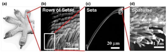 Hierarchical structure of a gecko toepad: (a) lamellar structures; (b) rows of setae; (c) tip of one single setae; (d) spatulae image. Reprinted with permission from [9]. 2018, Springer.