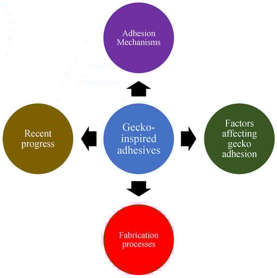 The novelty of this review is that it explains about the importance of both water and humidity on gecko adhesion, in addition to the significance of surface roughness on adhesives. Here, there are many examples cited with novel fabrication techniques for synthetic adhesives. The following sections discuss adhesion mechanisms related to natural geckos, factors affecting them, various adhesion mechanisms upon which gecko-based artificial adhesives are fabricated, and recent progress in this field (Figure 2).