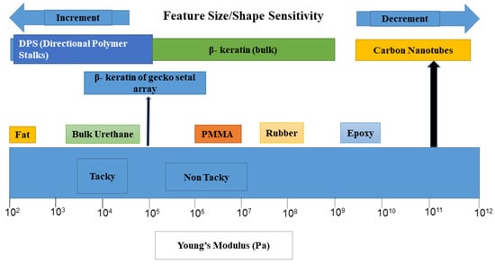 The origin of biomimetics can be dated back to 1950, when it was indicated that designs from biological creatures could be transferred to produce technologies in the form of machines, materials, and novel concepts that would be useful for humans [4]. Among these biological creatures, geckos have inspired researchers to develop synthetic materials over the past two decades. Autumn et al. [5] conducted one of the earliest studies in 2000 which laid the foundation for fabricating different synthetic adhesives inspired by gecko adhesion. Since then, considerable research has been conducted in the field of gecko-based adhesives [6,7,8]. The fabrication process, development, and design of these adhesives have been the primary focus areas for researchers to develop adhesive technology with high load-bearing capabilities and minimal fouling.