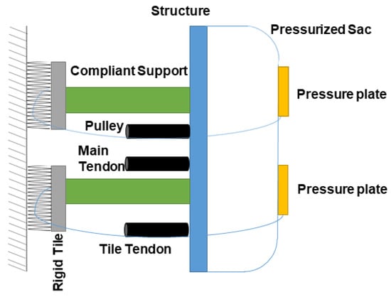 In Figure 5, the compliant support provides full contact with all tiles while preload is applied. Tile tendons pass from the center of each tile to a pressurized sac, which ensures that each tile obtains a similar loading force. The resultant of single forces pass through the structure and into the main tendon [34].