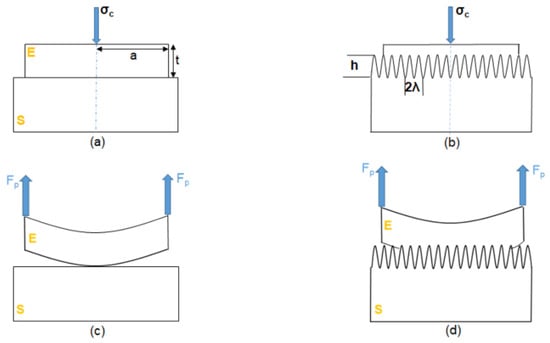 Attachment and detachment process involved in a soft flat elastomer robot foot with radius ‘a’ and thickness ‘t’. (a) Attachment of Vytaflex elastomer (E) to a smooth surface (S) when a compressive pre-load of σc is applied; (b) attachment of Vytaflex elastomer to a rough surface, with amplitude ‘h’ and roughness wavelength ‘λ’; (c) detachment process of Vytaflex elastomer from a smooth surface when a tensile force, Fp, is applied; (d) detachment process of Vytaflex elastomer from a rough surface when a tensile force, Fp, is applied. Adapted with permission from [58]. 2009, IEEE Xplore.