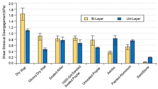 A chart showing experimental results of shear stress obtained using the bi-layer method and uni-layer method applied on different substrates. Adapted with permission from [43]. 2018, Elsevier.