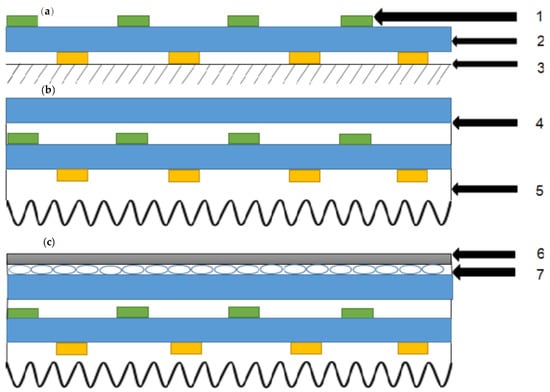 The fabrication process of fabricated hybrid adhesive anchor: (a) Metal is deposited giving the required electrode shape on the substrate (consisting of 1, 2, and 3); (b) A layer of PEN film over the positive electrode acts as an insulator. Putting gecko-inspired adhesive on the front surface finishes the adhesive pad (consisting of 4 and 5); (c) fabrication of full anchor is achieved by employing a foam-backed magnesium bracket (consisting of 6 and 7). Adapted with permission from [18]. 2018, IEEE Xplore.