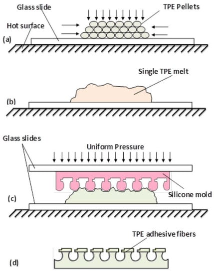 Fabrication process of SEBS thermoplastic elastomer performed by thermocompression modeling: (a) SEBS thermoplastic elastomers (SEBS-TPE) lying on a glass slide melted using slight pressure; (b) formation of a single SEBS-TPE melt; (c) a silicone mold placed on the single SEBS-TPE melt with desired force; (d) the silicone mold, SEBS-TPE melt, and glass slide are removed from the hot plate and allowed to cool. Later, TPE adhesive fibers are formed. Reprinted with permission from [45]. 2014, ACS.