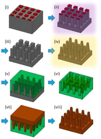 Fabrication process of tapered square silicon pillar template and their copy imprinted on an LDPE thermoplastic: (i) photoresist pattern process; (ii) deep reactive ion etching; (iii) removal of photoresist; (iv) hydrofluoric/nitric/acetic acid etching; (v) polycarbonate film molding; (vi) template peel off; (vii) LDPE film mold; (viii) dissolution of template in methylene chloride. Reprinted with permission from [46]. 2014, ACS.