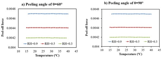 Figure 11 indicated that with an increase in peel-off angle (θ), there was a decrease in peel-off force (F) when surrounding humidity was not taken into consideration.