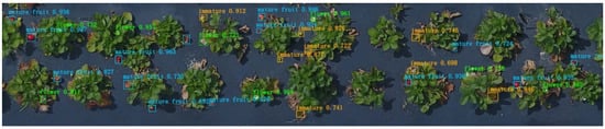 Deep learning models based on Faster R-CNN were trained using part of the image data from the 2017–2018 season []. The models were trained to detect not only flowers but also immature and mature fruit. The first step in implementing Faster R-CNN was to create the training data. Thus, orthoimages were split into small rectangle, and flowers and fruit were manually labeled using the open-source labeling tool. A total of 12,526 images were labeled, among which 80% were used for training and 20% were used for model testing.