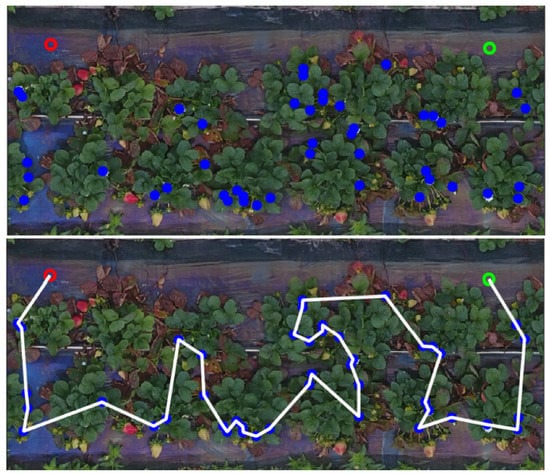 The path planning module seeks to solve the TSP associated with APS. The TSP in a classic sense is, given a list of cities, find the shortest route to pass through each city once and then return to the present location []. The parallel between the TSP and the APS path planning problem is clear. Instead of a list of cities, the agent, drone, or salesman is now attempting to pass through each flower location or waypoint once. Instead of returning to the original location, the agent now will seek to end at the other side of the row of strawberries or another crop.