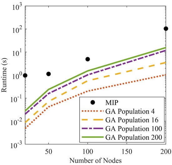 The question then arises, how close to the optimal solution is “good enough” for APS? Such a parameter could be tuned depending on real life use of APS; this analysis assumes that a GA solution with an objective function value within of the optimal, MIP solution would be sufficient for APS. With this assumption, a test was done to compare the computation time of GA and MIP. A set of random waypoints was generated within a 10 × 100 m2 rectangle, simulating a random row of some crop. The number of waypoints or nodes was set, and the optimal path was found with MIP. Then, four different GA configurations with varying population sizes were run to reach within of the solution found by MIP. Figure 6 shows the results.