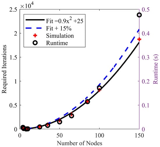 Fortunately, there is a reliable relationship between the required GA iterations, number of nodes, and GA runtime. A series of tests were conducted, generating random simulated crop rows as discussed previously with a range of number of nodes ranging from four to 150. The MIP solution was found, and then GA with population size four was run four different times, terminating upon reaching of the MIP solution. Note that every new use of the GA generates a new, random initial population. Thus, each run of the GA is unique. A curve fit of this data yields that the required number of iterations is a simple function of the number of nodes as shown below:
