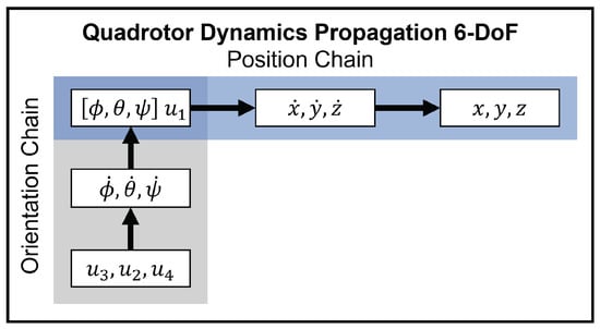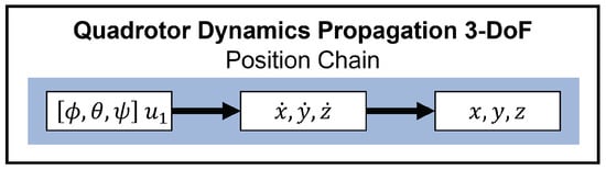 Figure 8 provides a map of how these variables are related through the dynamics. Notice the distinction between the position chain and orientation chain and how they are coupled. In Figure 8, it can be seen that , , affect , , , which affect , , . This is the orientation chain. The orientation chain feeds into the position chain as and , , drive velocity, which drives position, x, y, z. Maintaining the coupling of these two chains is essential to maintaining the physics of any modeling of the real world based upon this formulation.