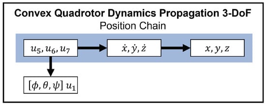 Now, an approach to the convexification of the nonlinear dynamics of the quadrotor system will be presented. This approach relies on successive linearization. It begins by breaking the dynamics in Equation (13) down further as