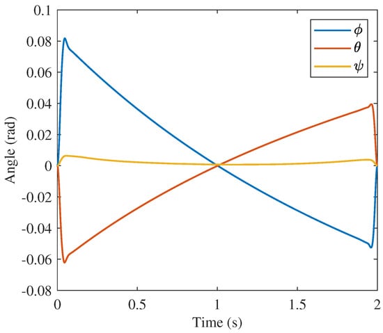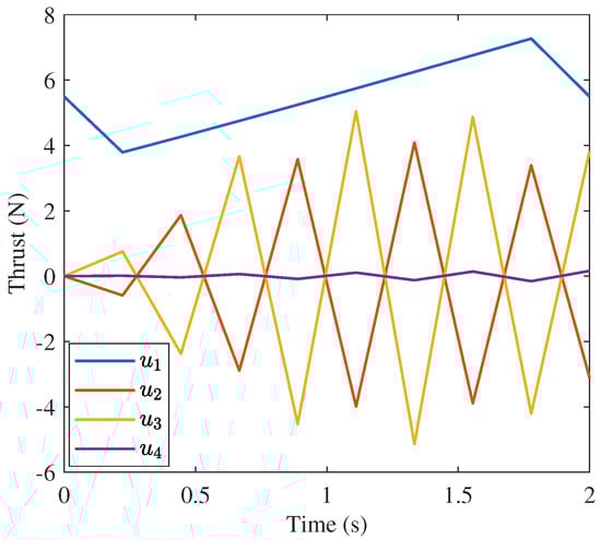 APS flight control seeks to solve the QFCP. Specifically, the six degree-of-freedom (6-DoF) QFCP seeks to control the quadrotor’s position in terms of Cartesian positions, x, y, z, and orientations based on Euler angles, , , . This paper makes use of the general formulation proposed by Lia et al. [], which requires the following state and control variables: