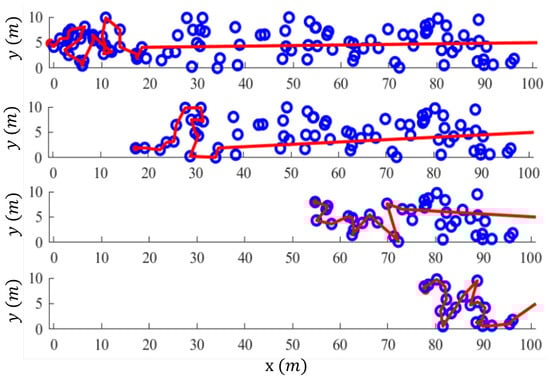 A simulation of the GA path planning algorithm within an MPC framework has been performed to demonstrate the benefits of MPC. A set of random waypoints was generated within a m2 rectangle, simulating a random row of some crop. 100 waypoints were generated for the test. MPC uses a receding time horizon and a distance horizon for computational efficiency. In the context of APS, that means that MPC will only predict and optimize the sequence of flowers within some distance of the quadrotor and for some short time. In the small rectangle that was generated for this demonstration, a 60 s time horizon and 20 m distance horizon were used. Figure 29 shows four distinct instants during the simulation.