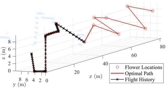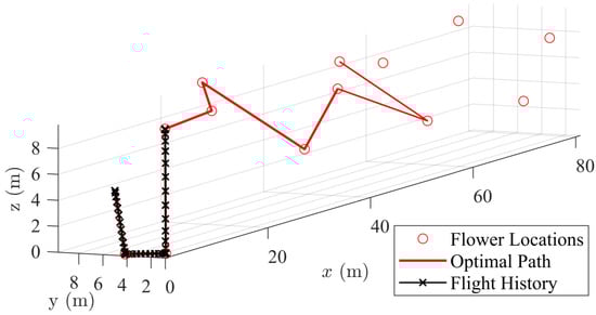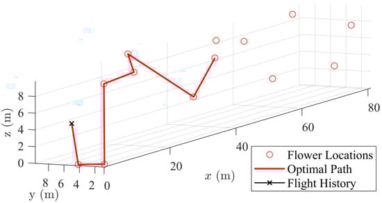 In general, it is best to buffer this slightly, as Equation (7) is a simple curve fit. Adding 10–15% to will ensure the desired accuracy is attained with minimal runtime. Figure 7 summarizes these results. With this relationship in hand, the GA algorithm is ready for use in APS. It has been shown that the GA is far more practical for meeting the specific needs of APS, as the vast speedup in computation time comes at the cost of a relatively small sacrifice in solution optimality. This is preferred for APS to ensure all the computational tasks required for the pollination mission can be successfully completed onboard. It is worth mentioning that constraints such as the endurance of the drone should be considered and tailored path planning algorithms need to be developed in the future to facilitate more practical solutions.