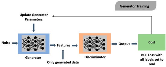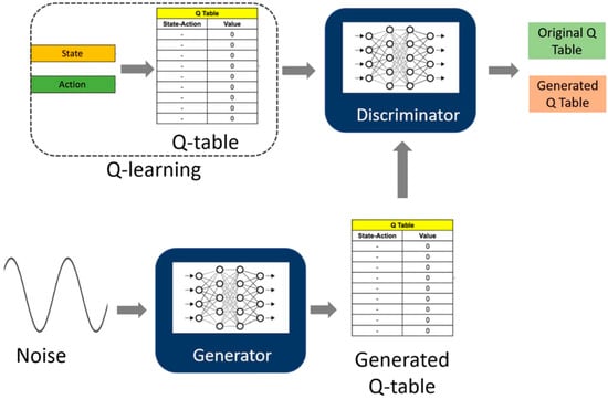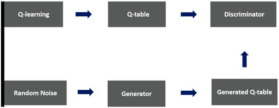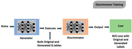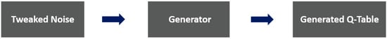 Input to the generator is a noise vector. A noise vector is a collection of random values in the form of a matrix. The matrix obtained from the numbers is of the same dimensions as the original q-table. The nature of these randomly generated values falls on the Gaussian curve []. This also provides control over what type of output is generated by the generator. Figure 7 and Figure 8 show the process for generator and discriminator training respectively.