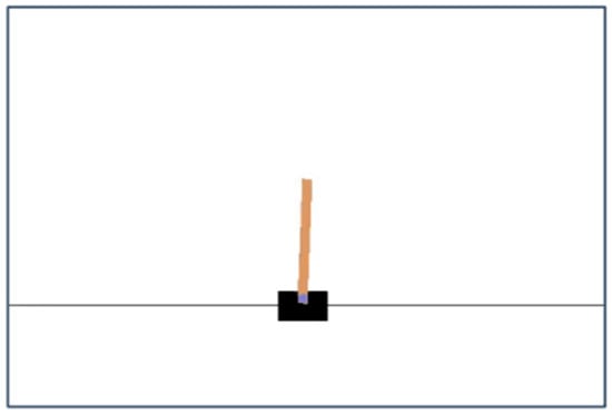 The first agent is trained in the OpenAI CartPole-v1 environment shown in Figure 6. Cartpole-v1 provides a 2D environment with a structure where a pole is attached to the cart and the cart is free to slide over a frictionless surface. The goal of this pole-carrying cart is to balance the pole in an upright position without letting it drop on either side. By sliding the cart left or right, the cart pole is balanced. Cartpole is controlled by applying force +1 and −1 to the cart.