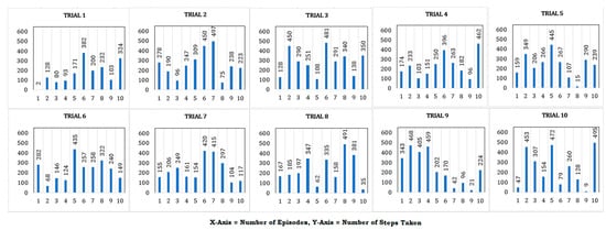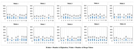 Figure 10 presents plots corresponding to the episode-wise performance of the cart pole agent. On the x-axis, the number of episodes is marked against the number of steps taken on the y-axis. Agent performance throughout the episodes averages around 52 steps per episode and the maximum of 500 steps per episode is never reached. The performance in these graphs is an illustration of less than adequate performance given by the agent upon introduction to different environmental parameters. The agent is performing here without GAN interference.