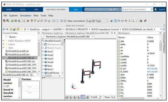 The KD and KDHD control laws were compared by means of the simulation environment Simscape MultibodyTM by MathWorks. The multibody model is shown in Figure 3, comprising two equal RRFbR manipulators, one with KD control and one with KDHD control, for a quicker comparison. The robots are subject only to gravitational forces. Friction in joints is neglected, in agreement with the analytical model discussed in Section 2.