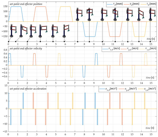 Figure 4 shows the set-point motion characterized by d = 0.15 m, tmov = 0.3 s, tstop = 1 s and α = 0.2, in terms of position, velocity and acceleration. These parameters correspond to trapezoidal velocity profiles of the displacements with maximum velocity of ±0.625 m/s. Acceleration alternates null values and constant values of ±10.416 m/s2 with duration αtmov = 0.06 s. This set point motion corresponds to the time histories of the internal coordinates shown in Figure 5.