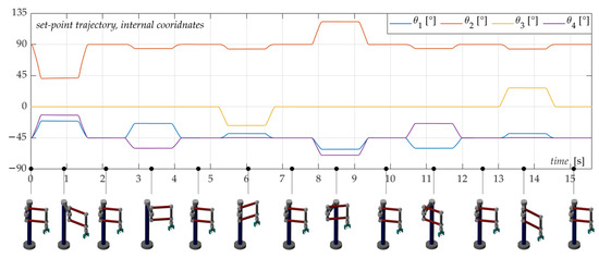 The end-effector orientation is kept constant along the planned motion. Nevertheless, this assumption does not limit the generality of the analysis because, as discussed in Section 3, it is reasonable to have the 1-DOF rotational behavior decoupled from the 3-DOF translational behavior, adopting block-diagonal stiffness and damping matrices. With this hypothesis and in absence of friction in the joints, the rotational behavior related to θ4 and τ4 is completely decoupled, and the tuning of the corresponding stiffness and damping matrix elements can be performed by the criteria already extensively discussed for the PDD1/2 control of SISO second-order linear systems [9,12].