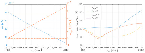 This is confirmed by the plots in Figure 7, which show the ISE of the KDHD control (blue plot) and hdxyz (orange plot) as a function of dxyz, applying the linear relationship (20): as dxyz decreases from 5000 to 0 Ns/m and hdxyz increases from 0 (KD control) to 47,200 Ns1/2/m (KDHD control without first-order damping, named KHD), the Integral Square Error decreases from 2.41 · 10−5 m2s to 2.02 · 10−5 m2s (−16%).