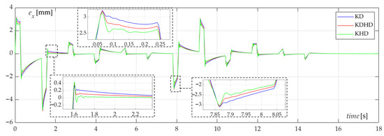 Table 2 collects the main performance indexes for the three controllers. From the analysis of Figure 8, Figure 9 and Figure 10, and from the data collected in Table 2, it is possible to observe that the peak errors are similar for the three controllers, with a maximum reduction of −2.45% for the KHD with respect to KD (ey coordinate), but the mean errors decrease more remarkably moving from KD to KHD, coherently with the ISE plot in Figure 7 (left). In particular, the reductions of the mean absolute values of the translational errors with respect to KD are around −5 ÷ −6% for the KDHD, and −10 ÷ −11% for the KHD, while the Integral Square Error decreases were −8.7% for the KDHD and −16.2% for the KHD.