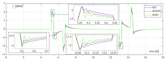 The effectiveness of the stiffness compensation of the KDHD control law (17) was verified in [18,19]. The KDHD control law (17) will be compared in the following with the classical KD algorithm, expressed by Equation (11).