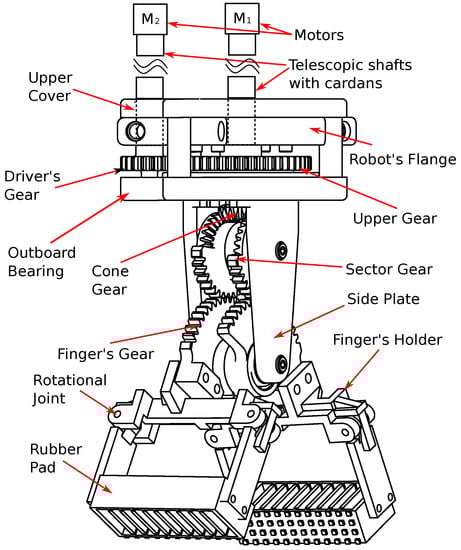 A novel gripper design is inspired by two degrees of freedom (DoF) epicyclic mechanism and consist of two motors mounted on the robot’s frame, two telescopic shafts, a Torque Distribution Gearbox, and soft fingers (Figure 1). Motor M1 is in charge of opening/closing the fingers and providing desired grasping force, while M2 rotates the gripper around the vertical axis. Due to the design, these motors have a mechanical linkage that is compensated in real-time by the controller proposed in Section 4.