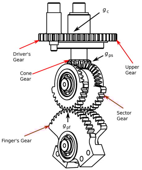 The Torque Distribution Gearbox can be considered as a 2-DoF epicyclic mechanism. Unlike most of the grippers, it creates a mechanical linkage between the motors used to perform gripper’s rotation and transnational movements of the fingers. In the mechanism the Driver’s gear plays the role of a driver and the Cone gear becomes the sun, which is connected with the satellite, implemented by Sector gear and connected to the Finger’s gear. Thus, the dependency between angular accelerations and velocities of the gripper’s parts can be expressed by Equations (5) and (6).