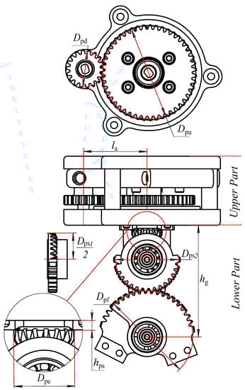 All the parts of the proposed design can be parameterized to meet specific project requirements. The upper cover size is mainly determined by the distance between motors’ axes and the pitch diameters of Driver’s and Upper gears, defined as and , respectively, (Figure 4). Those parameters are linked through (1).