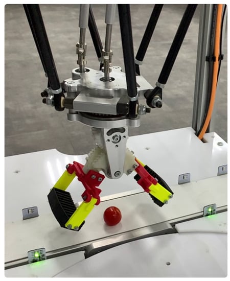 Pick and Place operations are frequently used in different industrial applications [1,2], especially in the food industry [3,4]. Typically Pick and Place operations are implemented using SCARA or Delta robots with four degrees of freedom: three transnational degree and one rotation around a vertical axis [5,6]. Another feature of these operations is their high speed: for example, Delta robots are designed to perform up to 150 Pick and Place operations per minute [7]. To ensure a high dynamics, it is necessary to significantly reduce the mass of the moving parts of the Delta robot, especially the gripper mounted on its flange. At the same time, adding a rotary unit, force sensors, or attempting to enlarge grasping force leads to heavier designs and significantly limits robot’s accelerations.
